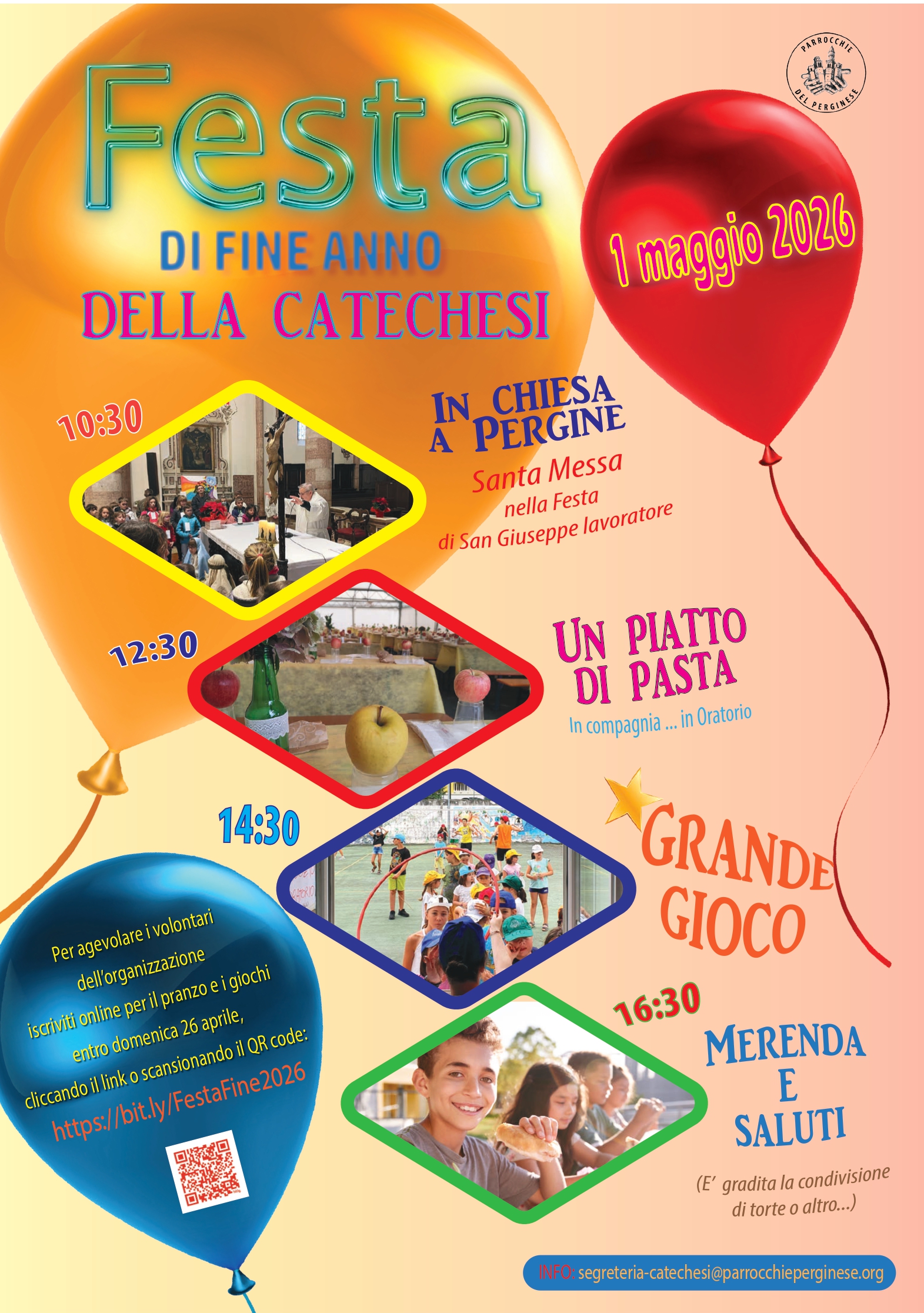 Le Parrocchie del Perginese sono liete di invitare bambini, ragazzi, famiglie e tutta la comunità alla Festa di fine anno della Catechesi, un momento di gioia, condivisione e ringraziamento per il cammino vissuto insieme durante l’anno.