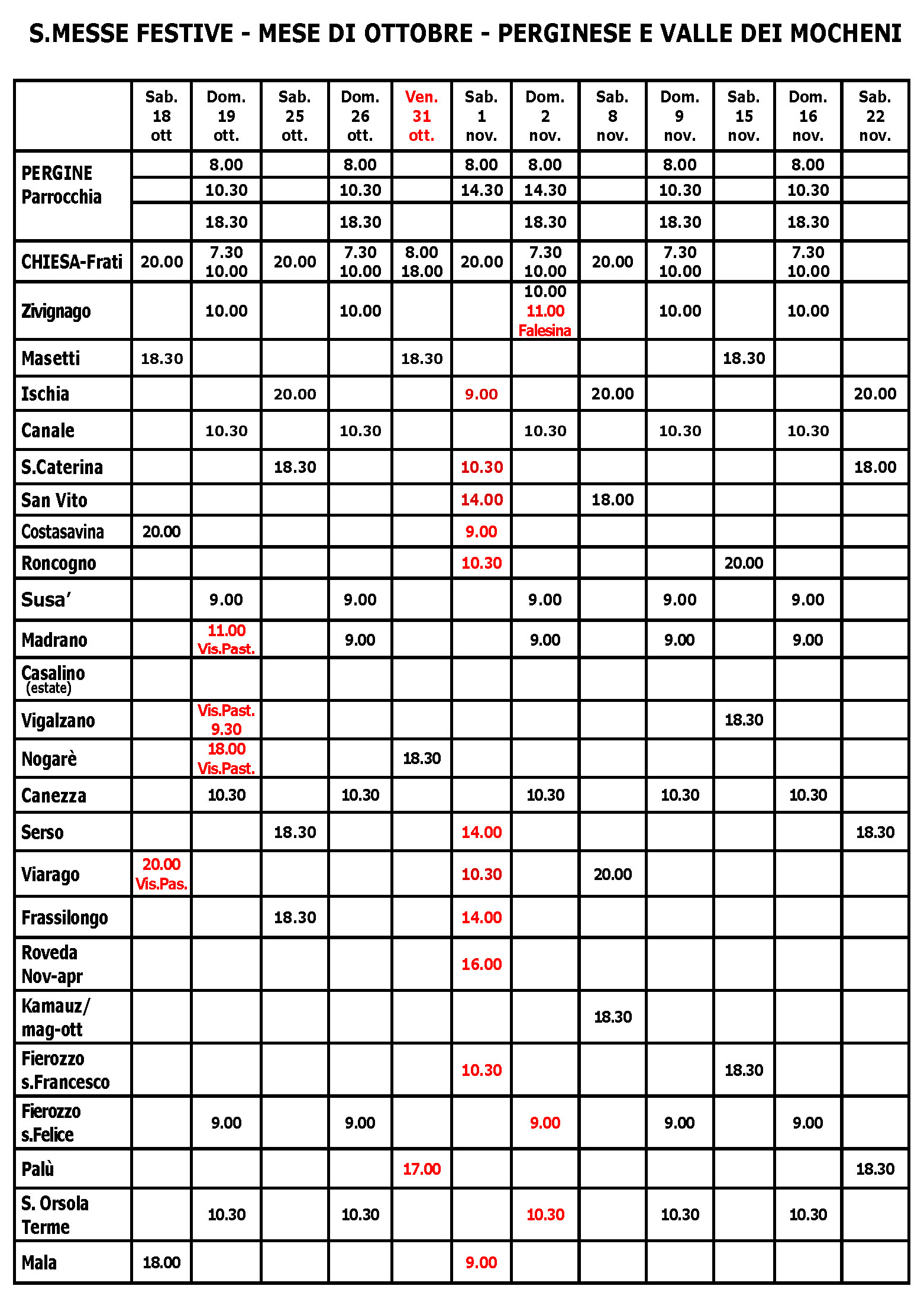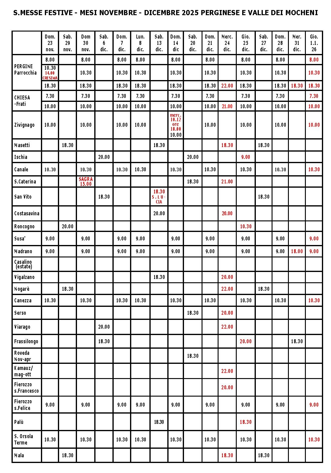 © 2025 Arcidiocesi di Trento PARROCCHIE DEL PERGINESE – OLTREFERSINA – VALLE DEI MOCHENI Pergine, Masetti, Zivignago, Ischia, Canale, Castagné San Vito, Castagné Santa Caterina, Susà, Costasavina, Roncogno, Canezza, Madrano, Nogarè, Vigalzano, Serso, Viarago, Mala, Sant'Orsola Terme, Palù del Fersina, Fierozzo San Felice, Fierozzo San Francesco, Frassilongo, Roveda