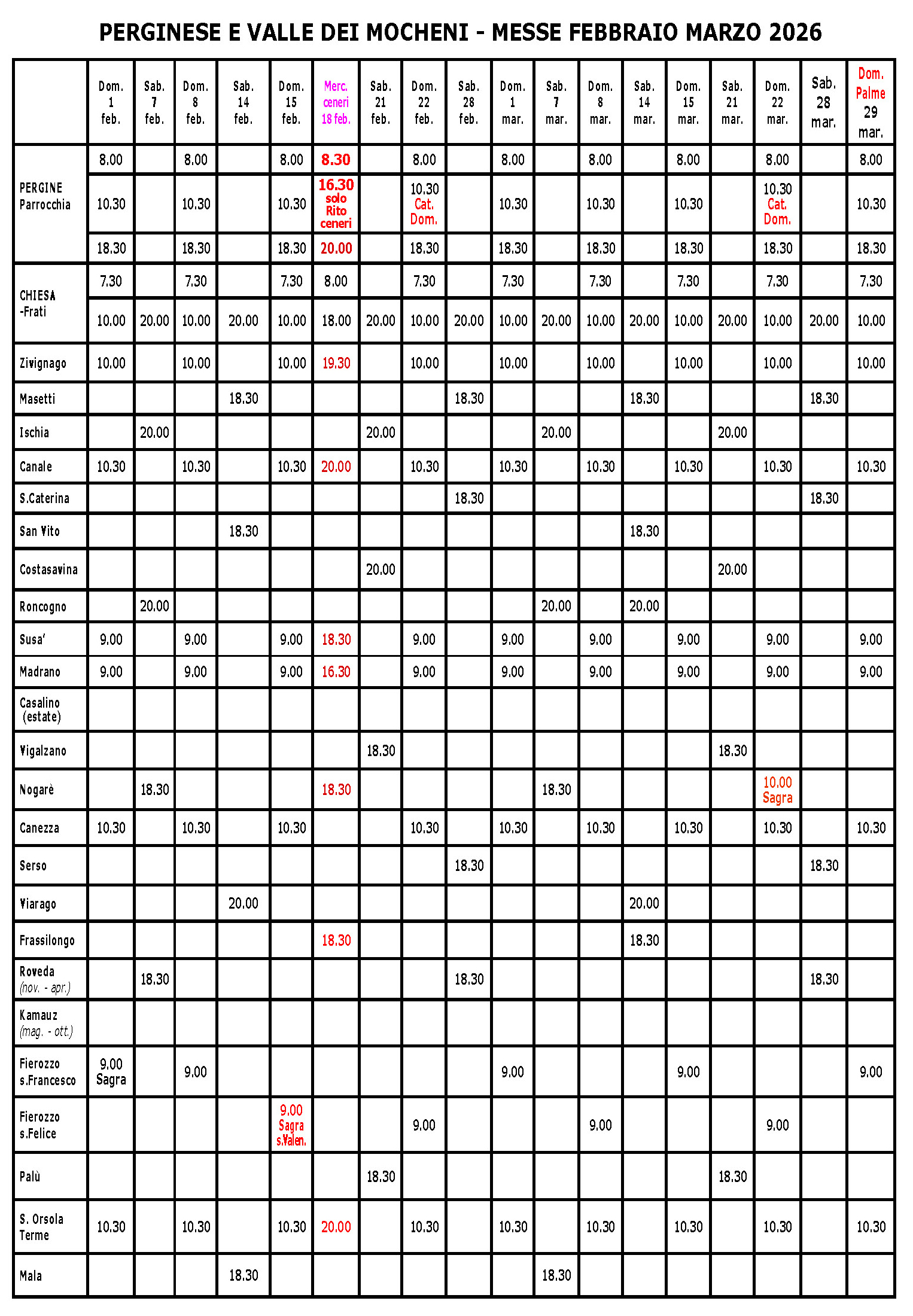 PARROCCHIE DEL PERGINESE – OLTREFERSINA – VALLE DEI MOCHENI